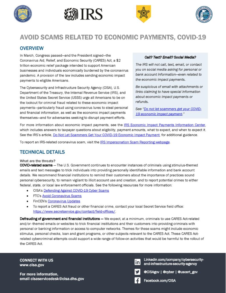 The Cybersecurity and Infrastructure Security Agency (CISA), U.S. Department of the Treasury, the Internal Revenue Service (IRS), and the United States Secret Service (USSS) urge all Americans to be on the lookout for criminal fraud related to these economic impact payments—particularly fraud using coronavirus lures to steal personal and financial information, as well as the economic impact payments themselves—and for adversaries seeking to disrupt payment efforts.